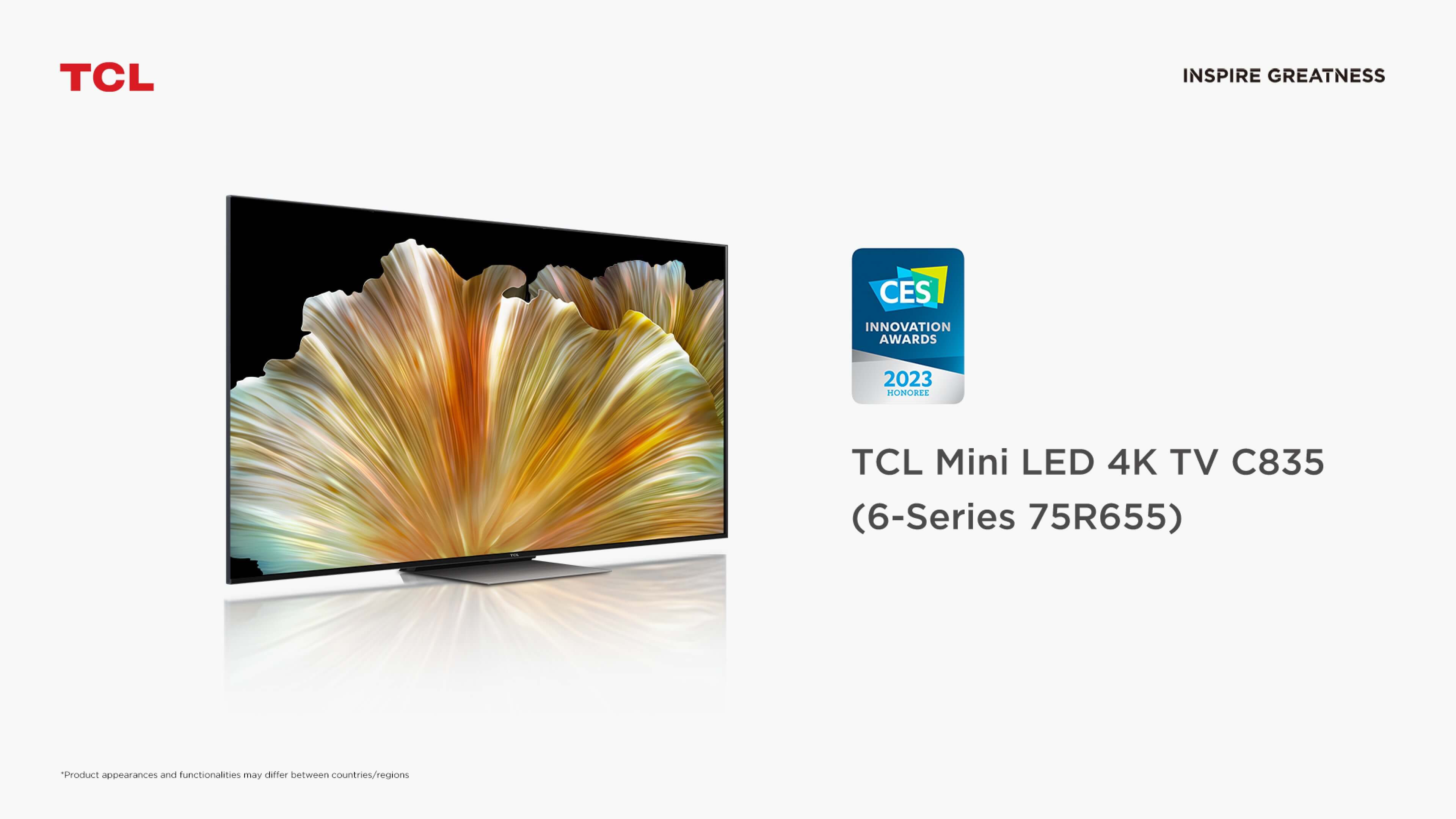 ผู้บริโภคชั้นนำ ซึ่งเป็นเกียรติอย่างมากที่ได้รับรางวัลนวัตกรรม CES® 2023 สำหรับ TCL Mini LED 4K TV 75C835 (มีจำหน่ายในอเมริกาเหนือในชื่อ 6-Series 75R655) ผลิตภัณฑ์นำเสนอการออกแบบนวัตกรรมใหม่และ