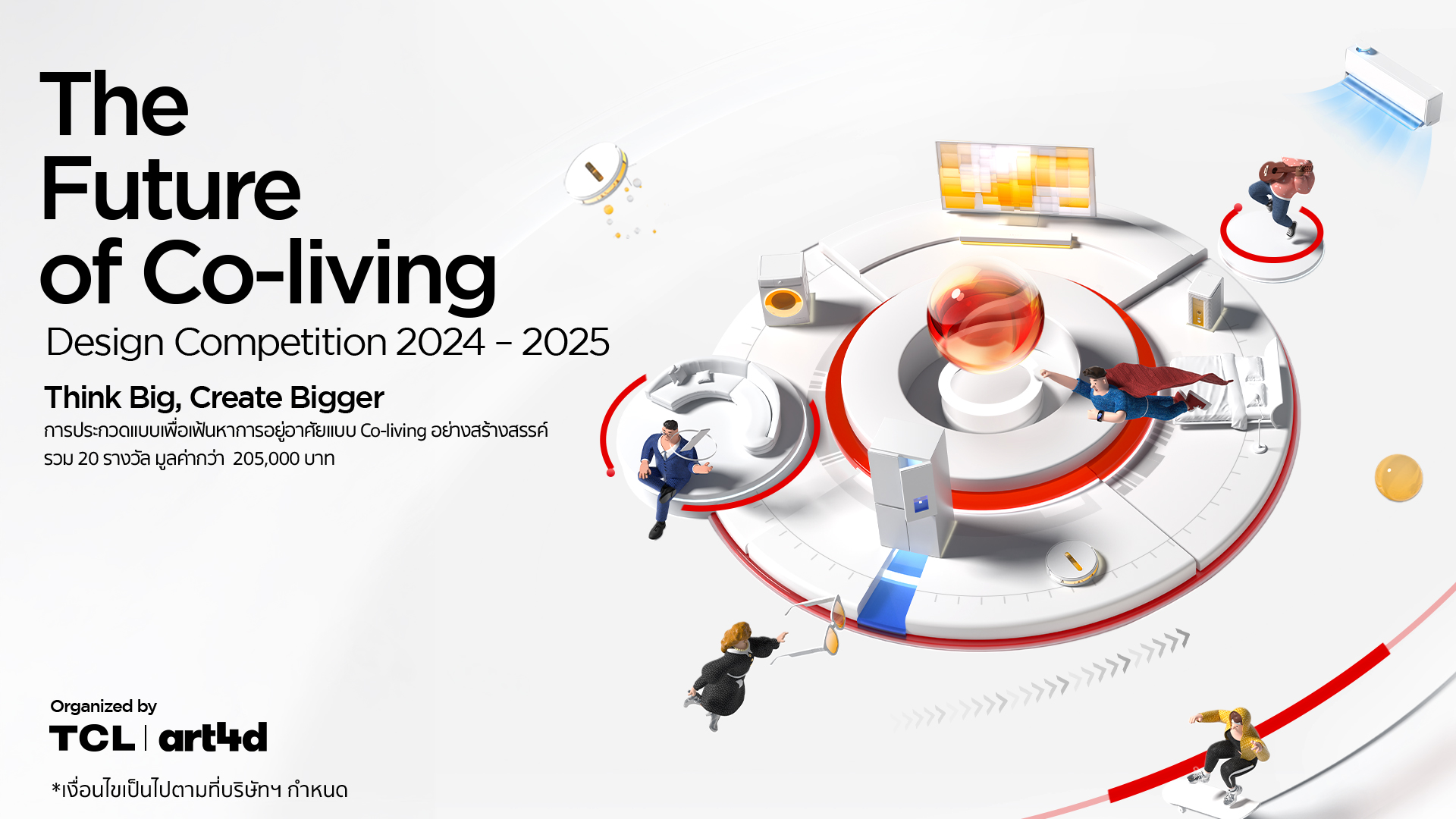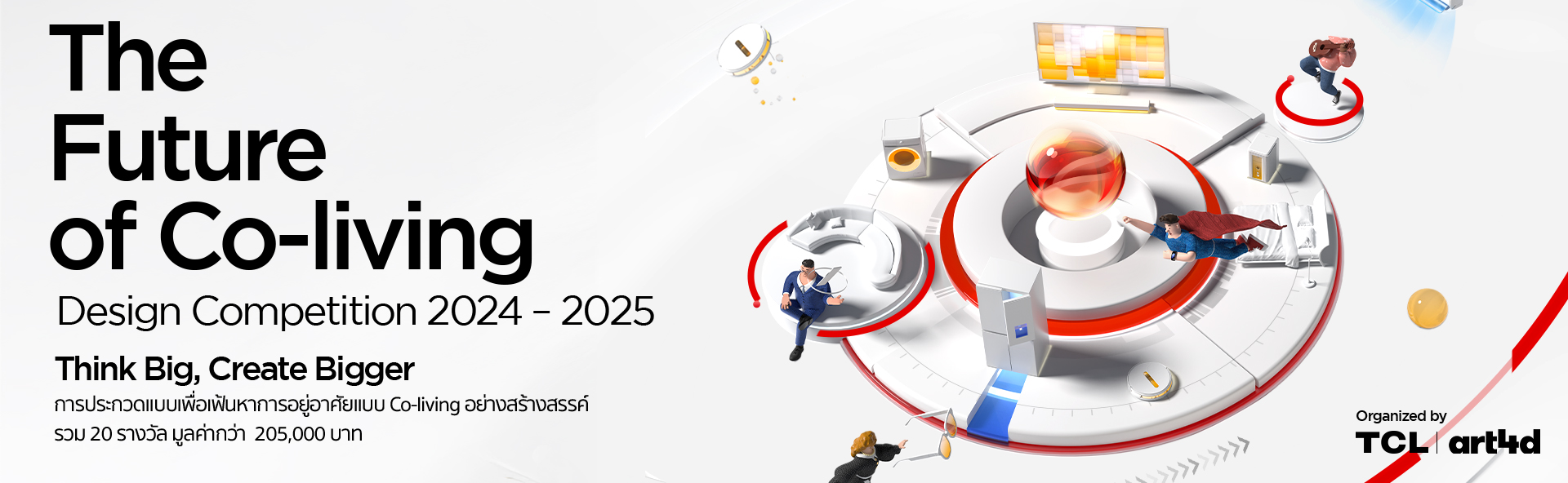 TCL ร่วมกับ art4d เชิญชวนนิสิตและนักศึกษาระดับอุดมศึกษาในสาขาวิชาที่เกี่ยวข้องกับการออกแบบ เข้าร่วมการแข่งขันออกแบบ “The Future of Co-living” เพื่อต่อยอดนวัตกรรมใหม่ๆ สำหรับการอยู่อาศัยร่วมกันในอนาคต โดยการนำเสนอแนวคิดที่สอดคล้องกับนวัตกรรมของ TCL ในโอกาสครบรอบ 20 ปีของ TCL ในประเทศไทย