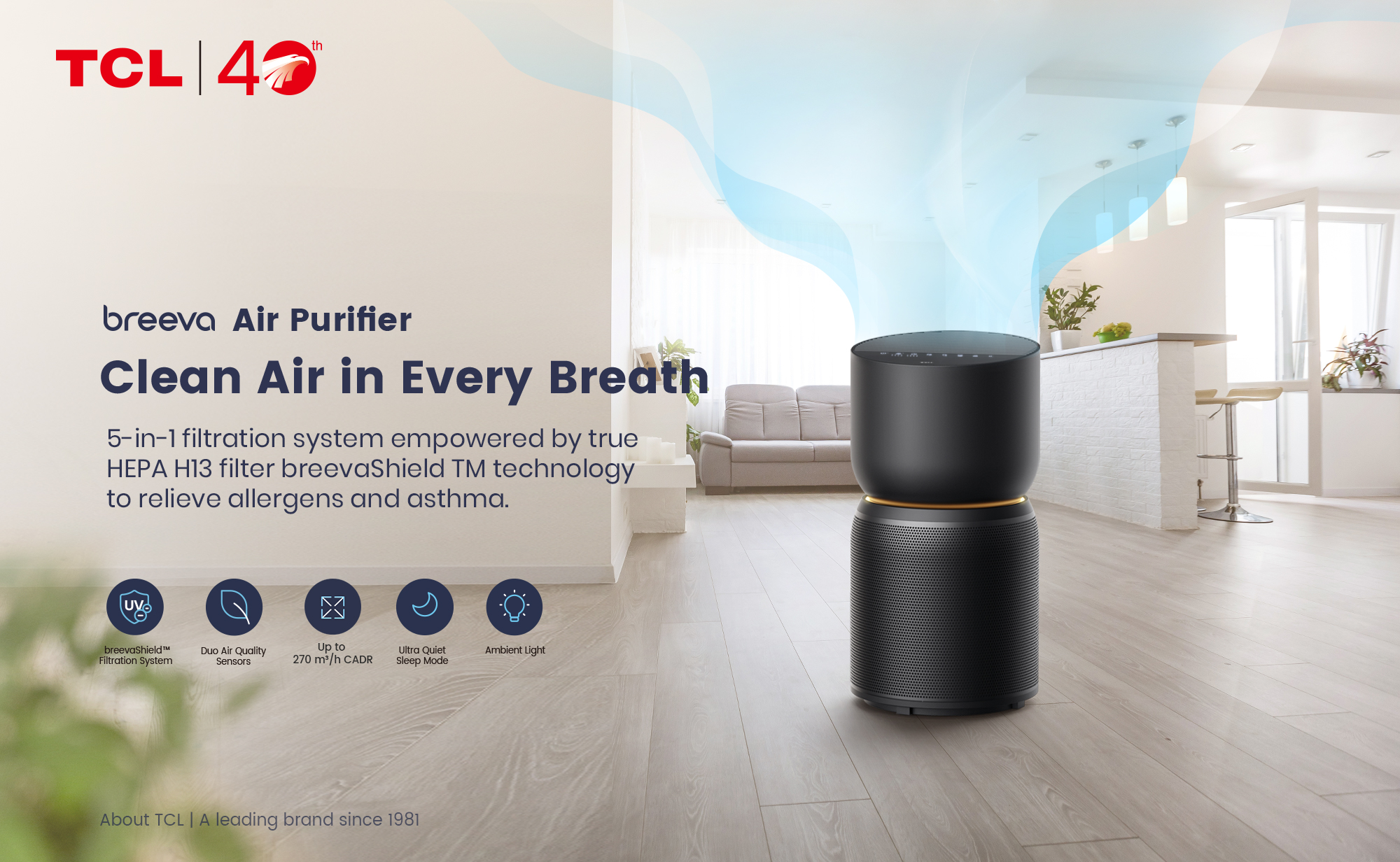 Pre-filter captures larger particles,such as dust, pet hair, fines, flocs, etc; HEPA H13 filter, specified by European Union EN1882, captures 99.97% of airborne particles as small as 0.3μm The 3rd filter - activated carbon absorbs odor and VOC. The 4th protection – Breeva Shield TM Anion makes the finer particles in the air agglomerate and settle. The 5th protection- Breeva Shield TM UV-C sterilization destroy the DNA and RNA of bacteria and virus