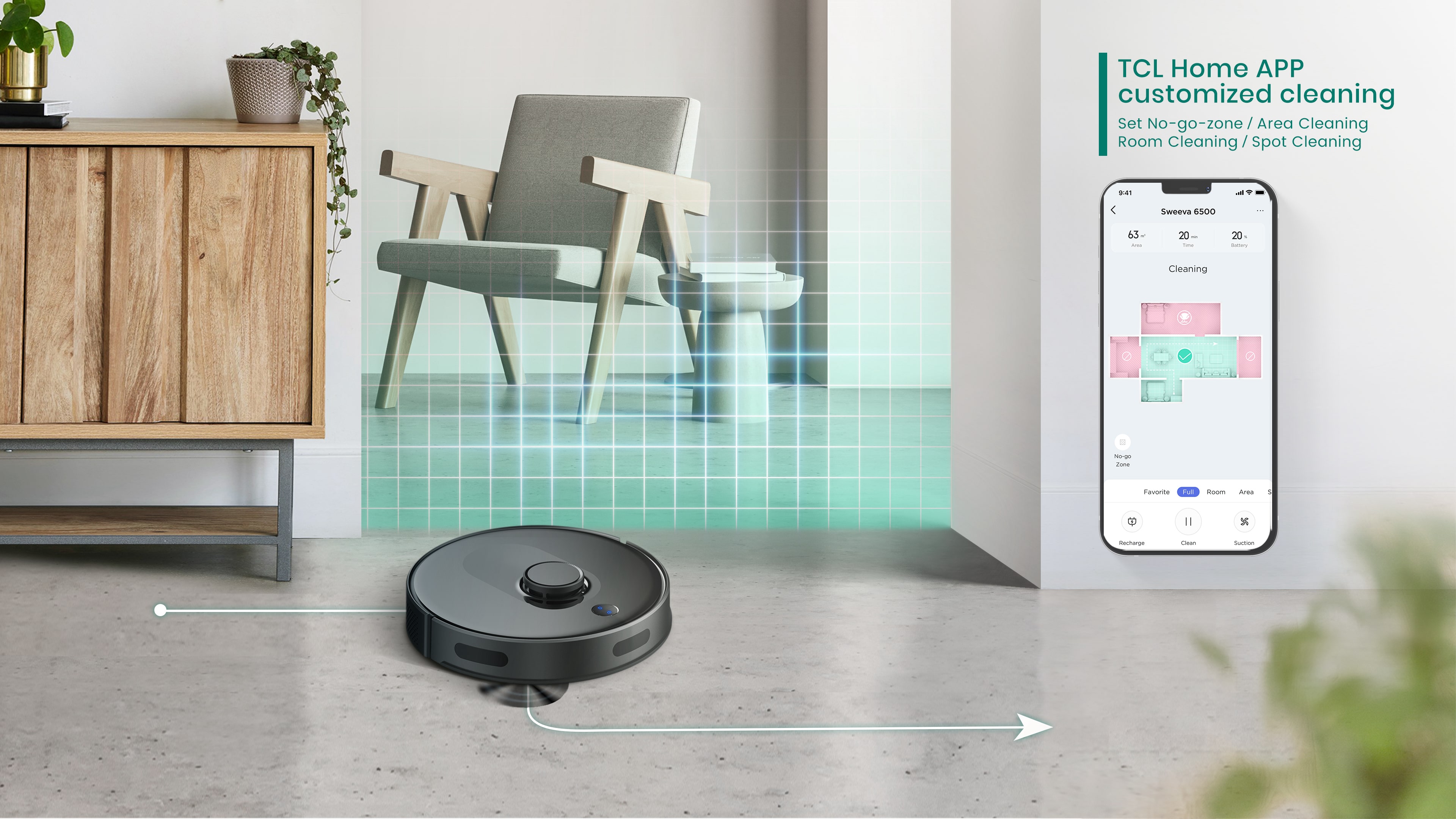 Use TCL Home APP to schedule cleaning, pin-and-go customized area cleaning, set no-go zone and more