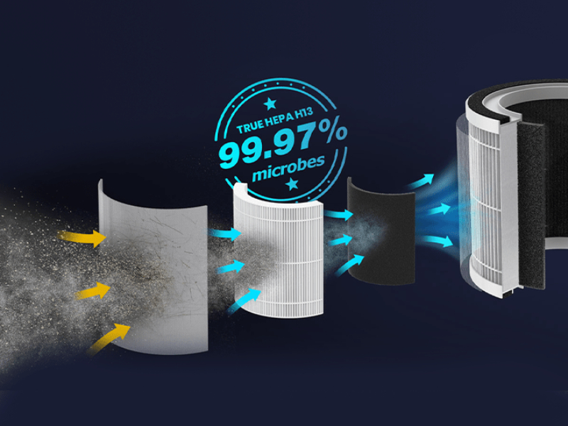 Toz, polen, küf, bakteri ve diğer havadaki partiküllerin %99,97'sini ortadan kaldıran ve ayrıca koku, duman ve ev temizlik malzemelerinde bulunabilecek uçucu organik bileşikleri emen ön filtre, Gerçek HEPA filtresi (H13) ve aktif karbon filtresi içerir.
