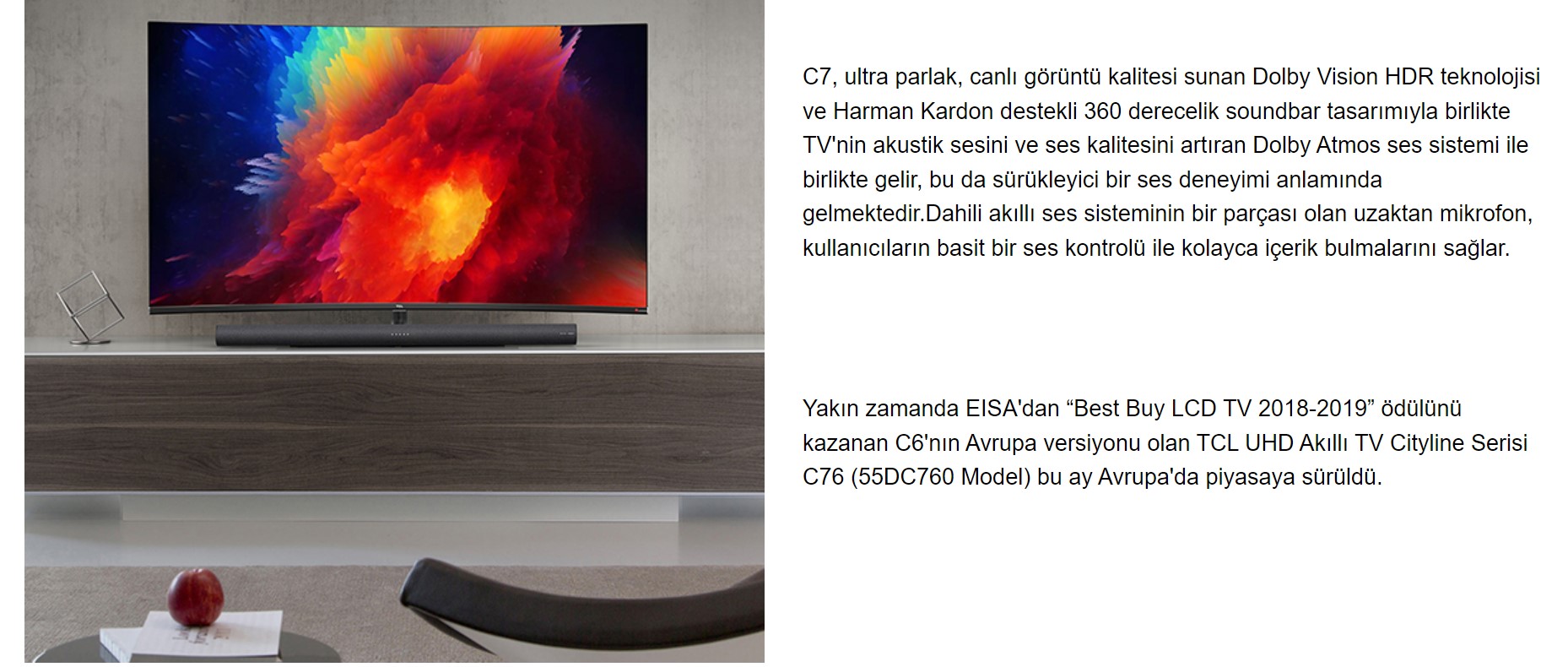 TCL Cityline Serisi C7 kavisli bir tam ekrana sahip olup, zarif ve zevkli yaşamayı tercih eden insanlar için modern bir hisse sahip bir UHD akıllı TV'dir.C7, bağımsız çalışmasını sağlayan AI destekli ayrı bir ses sistemine sahiptir.