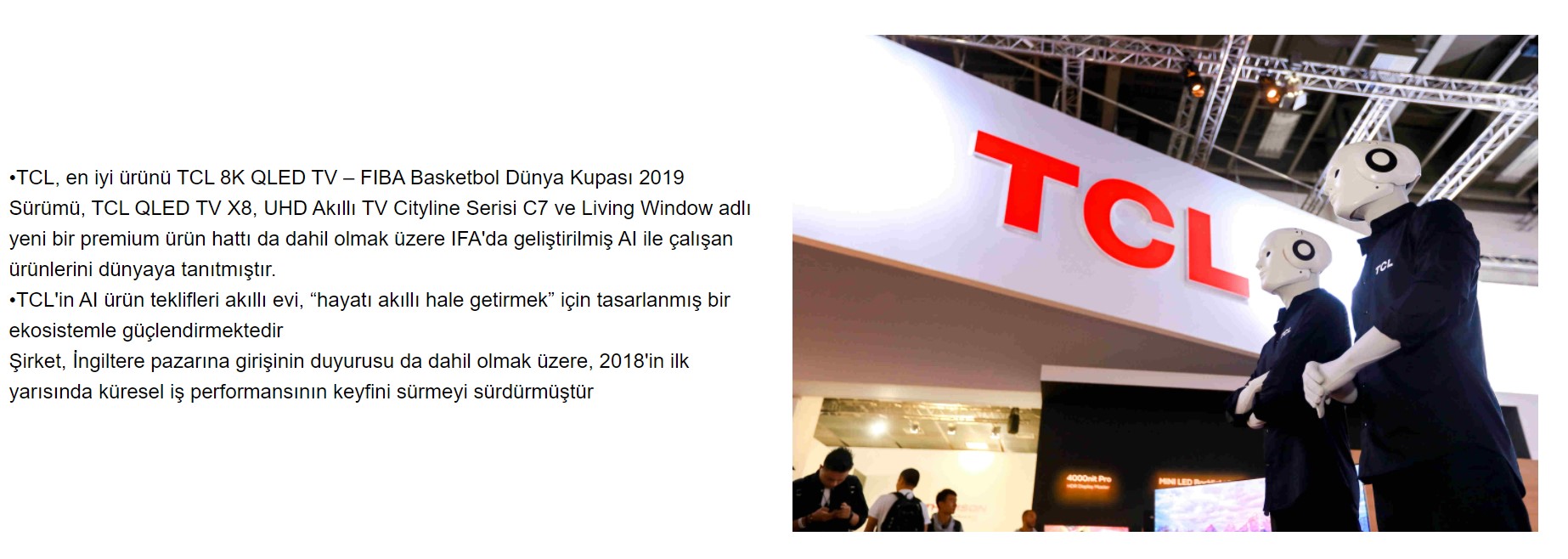 [Berlin, 30 Ağustos 2018] Dünyanın en büyük üç televizyon markası ve önde gelen tüketici elektroniği şirketinden biri olan TCL, ilk 8K TV'si olan TCL 8K QLED TV - FIBA dahil Basketbol Dünya Kupası 2019 Sürümü, TCL QLED TV X8, UHD Akıllı TV Cityline Serisi C7 ve sıradışı tasarımı içeren yeni bir premium ürün serisi olan Living Window serisi de dahil olmak üzere, yeni yapay zeka (AI) TV tekliflerini, IFA 2018 Berlin'de tanıttı.