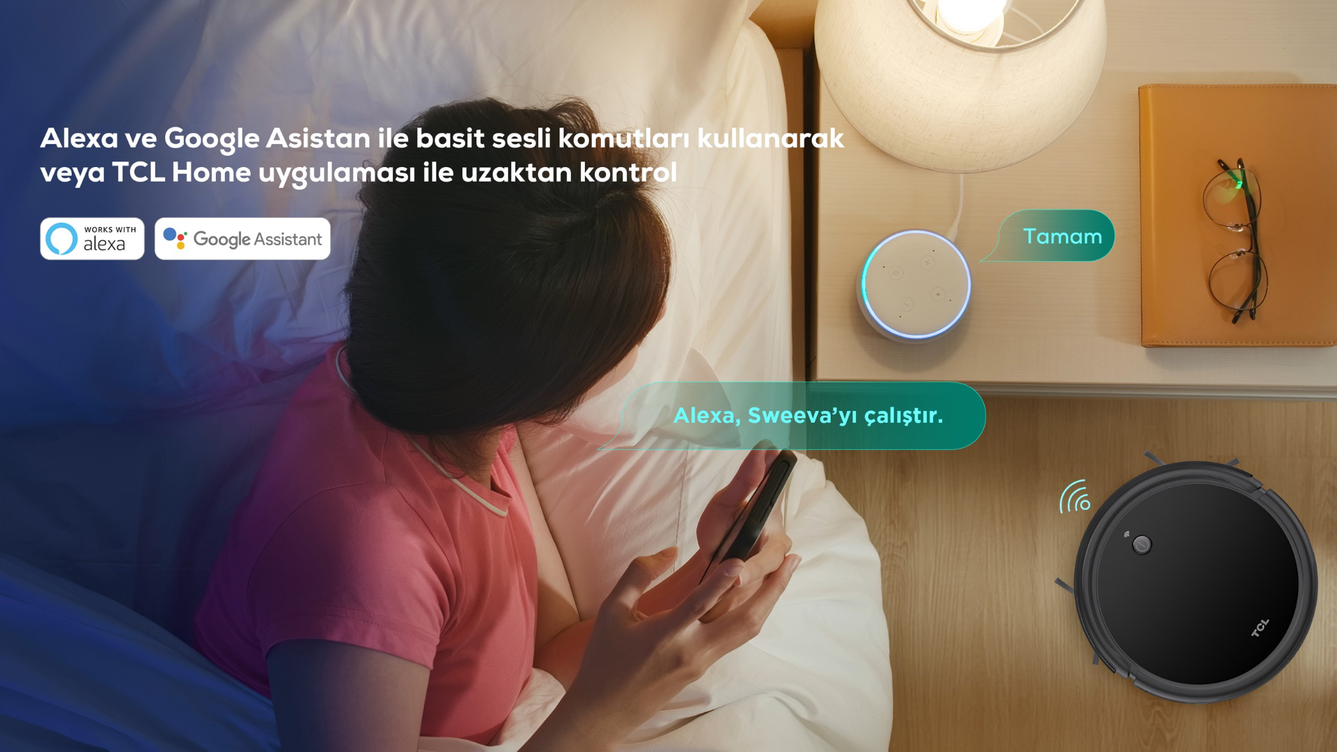 Alexa ve Google Asistan ile ses kontrolü veya TCL Home Uygulaması ile uzaktan kontrol.