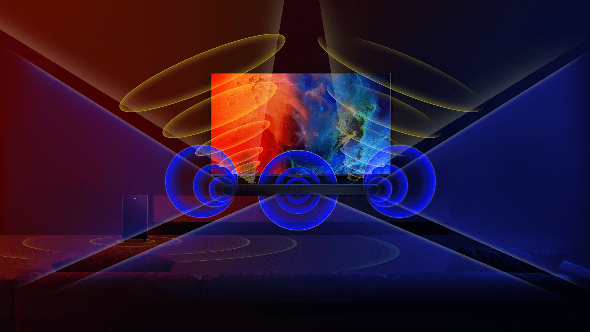 Автентичні канали 3.1.2 з двома гучномовцями та бездротовим сабвуфером Ground Shaking створюють мульти об'ємний звук