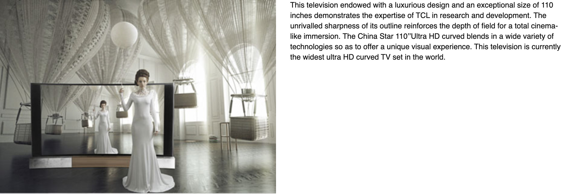 This television endowed with a luxurious design and an exceptional size of 110 inches demonstrates the expertise of TCL in research and development. The unrivalled sharpness of its outline reinforces the depth of field for a total cinema-like immersion. The China Star 110’’Ultra HD curved blends in a wide variety of technologies so as to offer a unique visual experience. This television is currently the widest ultra HD curved TV set in the world.