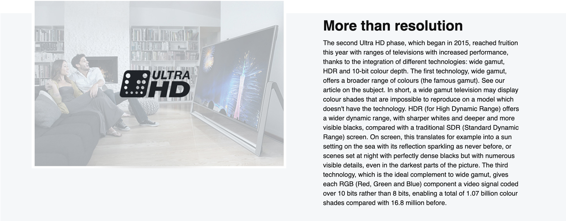 The advent of Ultra HD technology, which is an evolution from Full HD, experienced two distinct phases. The first phase, which was linked to the first Ultra HD television, only offered increased definition with a resolution of 3 840 x 2 160 pixels, i.e. around 8 million pixels compared with 2 million for Full HD models. While the picture quality displayed was more precise (four times more pixels on the screen, which was pretty good!) the other picture components remained identical to the HD format used by the Full HD screens and Blu-Ray disks in particular.