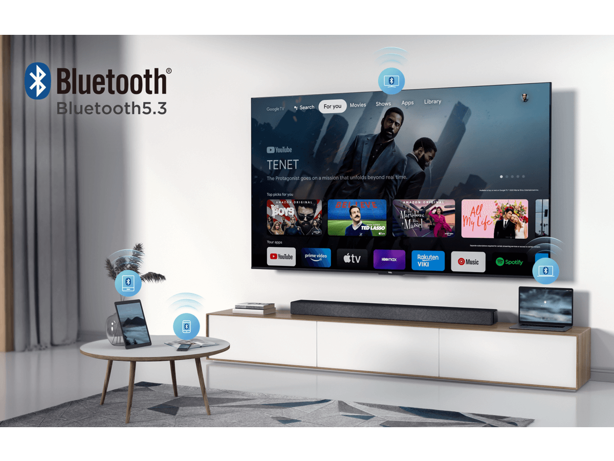 With Bluetooth 5.3 support, it is incredibly easy to turn your soundbar into a powerful music system. Make your music fill the living room and share the enjoyment with your friends or family with no latency.