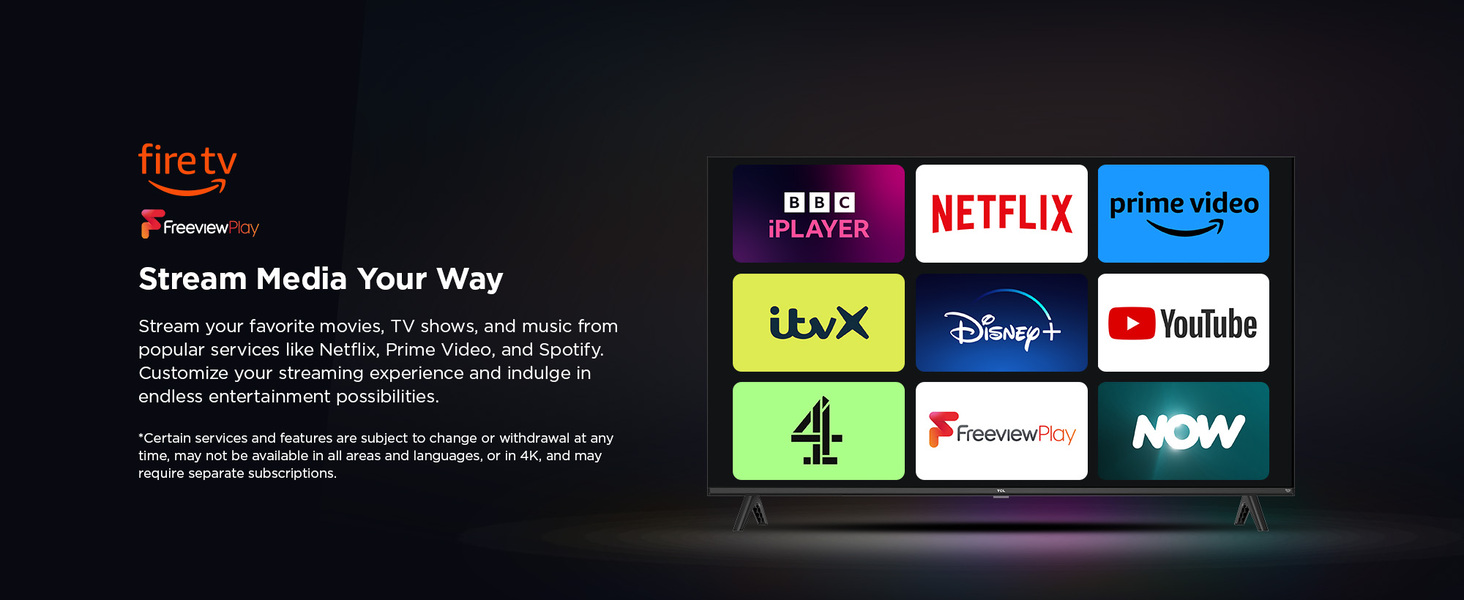· Endless entertainment: With Fire TV built-in, enjoy endless entertainment on thousands of apps and channels, including BBC iPlayer, Netflix, Prime Video, YouTube, Disney+, NOW, Freeview play and many more. (subscription fees may apply)