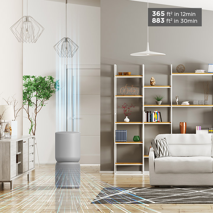 *The air purifier filters the air 5 times an hour (or one time in as little as 12 minutes) in a room up to 365 square feet. This result has been validated through internal testing.