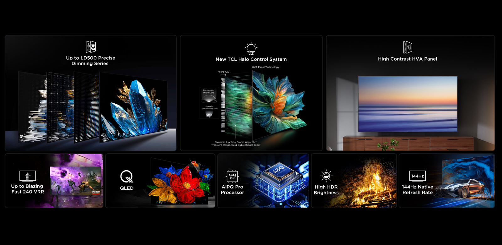 The TCL all-domain halo control technology covers the entire path from light generation to imaging. The combination of TCL-developed high-efficiency light-emitting chips and lens technology, Micro-Optical Distance technology, light and shadow control algorithms, and high-end HVA Panel technology, it effectively solves the halo problem and delivers a premium viewing experience through system-level precise control of light.