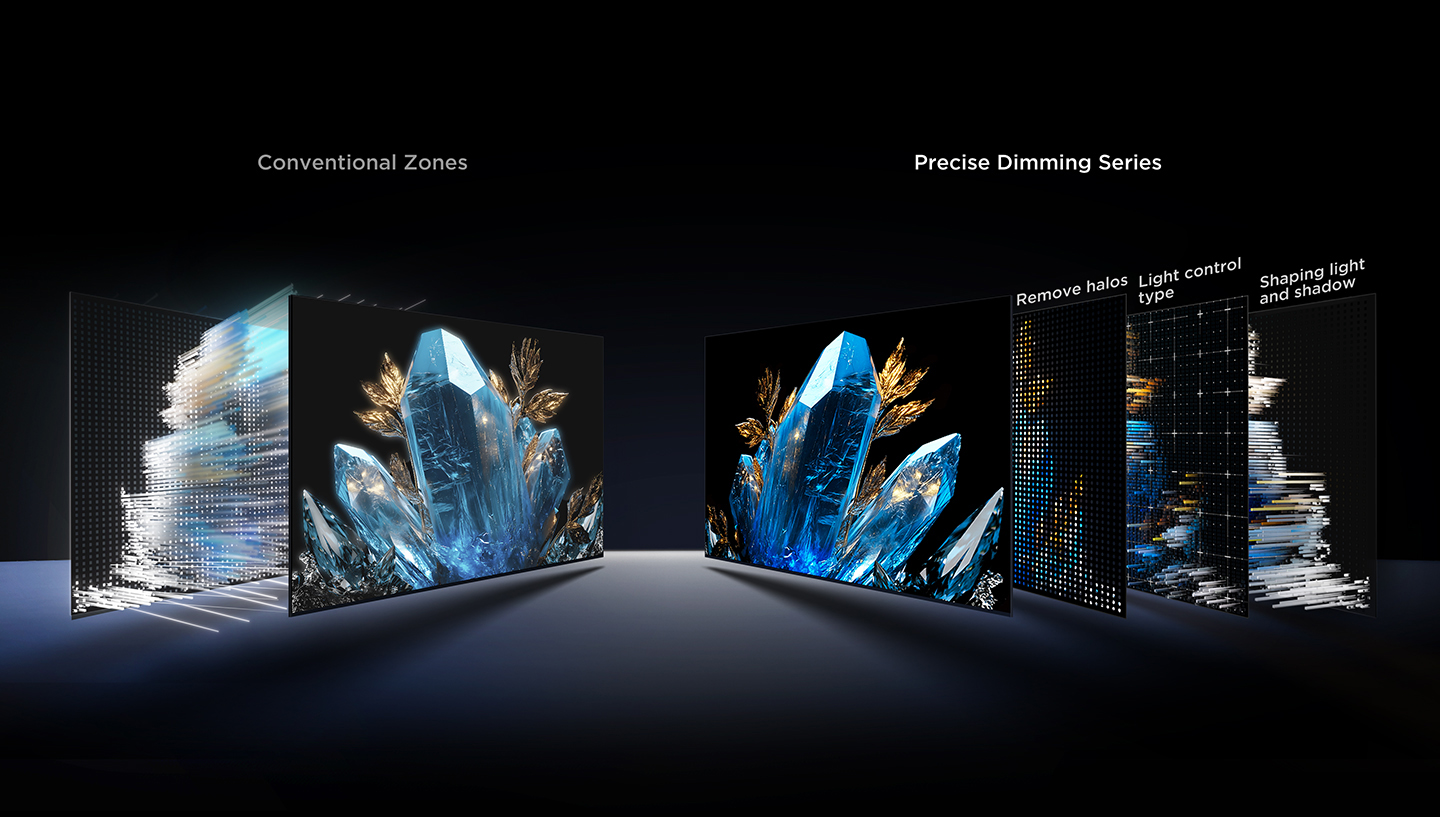 Precise Dimming series refers to Mini LED TV with all-domain halo control technology. The new generation of powerful light-emitting chip, super condensed Micro lens and Micro-OD make the light shape of individual zones more perfect, and its halo control ability is several times that of ordinary zones. Combined with the WHVA panel with higher native contrast ratio and the world's leading light and shadow control algorithm, Precise Dimming series shapes the real light and shadow so that the TV's comprehensive picture quality performance is dramatically improved compared to ordinary TVs, bringing an upscale image experience.