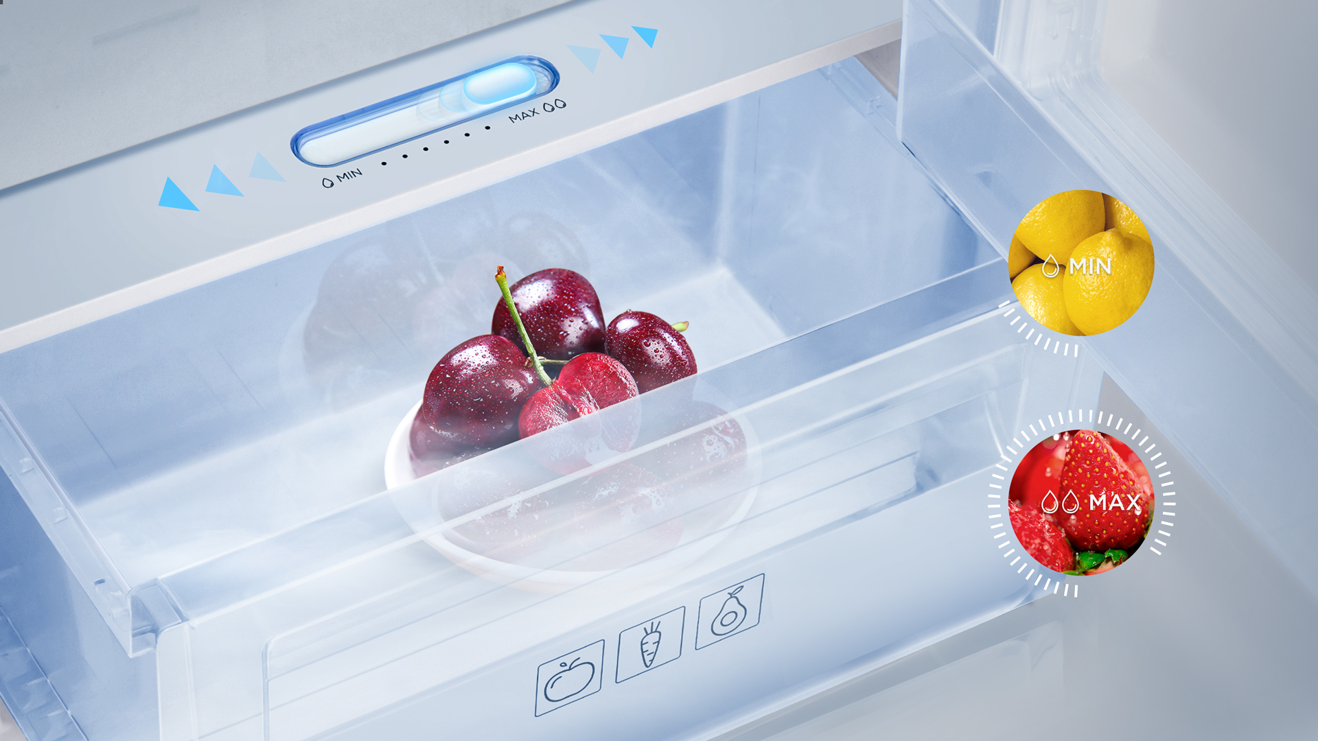 Empuje la palanca para ajustar la humedad en el cajón fresco, ajuste la humedad óptima para la conservación de los alimentos y mantenga la frescura de los alimentos durante un período más largo.