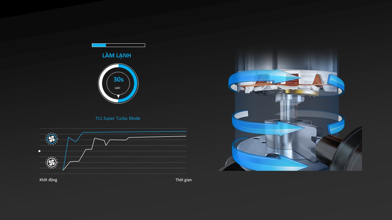 Với hệ thống tản nhiệt và máy nén hiệu suất cao, điều hòa TCL nhanh chóng mang đến luồng không khí mát mẻ và cực kỳ thoải mái khi vận hành chỉ với 1 nút nhấn Turbo.