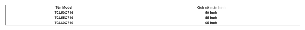 Hiện nay, QLED TV TCL Q716 được ra mắt với 3 kích cỡ chính, bạn có thể lựa chọn kích cỡ màn hình phù hợp với nhu cầu và không gian sống của gia đình.