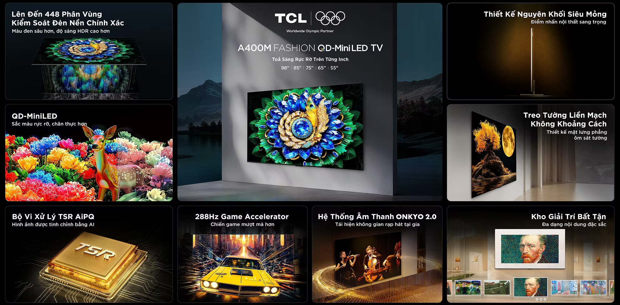 TCL A400 Pro FASHION QD-Mini LED TV là lựa chọn dành cho những không gian sống theo đuổi sự khác biệt, nơi công nghệ trở thành một phần của ngôn ngữ thiết kế. Sở hữu diện mạo sang trọng cùng trải nghiệm hình ảnh cao cấp, sản phẩm không chỉ nâng tầm nhu cầu thưởng thức mà còn góp phần định hình phong cách sống hiện đại, tinh tế và đầy cá tính. Trong một không gian được chăm chút về ánh sáng, chất liệu và bố cục, A400 Pro hiện diện như một điểm nhấn nổi bật, giúp tổng thể trở nên đẳng cấp, cuốn hút và trọn vẹn hơn. TV có thiết kế đa dụng vừa treo tường, để trên kệ hay có chân đứng độc đáo rất phù hợp với nhu cầu đa dạng.