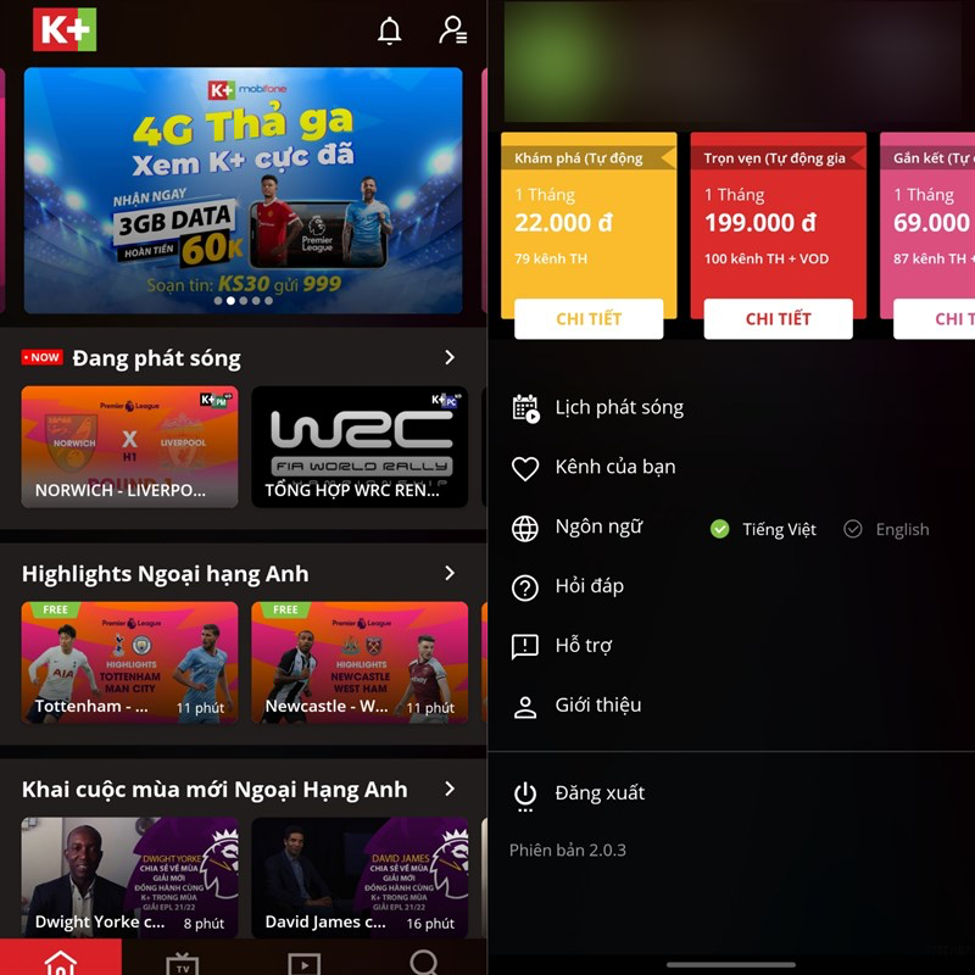 Bước 1: Sau khi tải về và cài đặt hoàn tất , bạn mở ứng dụng lên và chọn vào biểu tượng hình cá nhân ở góc trên bên phải. Tiếp theo các gói K+ sẽ hiện ra gợi ý và anh em chọn vào Chi tiết để biết thêm thông tin các gói.