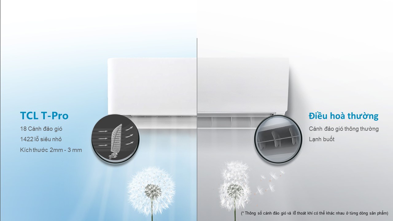 Cánh đảo gió hình chiếc lá độc quyền của TCL với hàng ngàn lỗ thoát khí siêu nhỏ, giúp không khí lạnh được xếp thành nhiều tầng mềm mại tạo ra luồng gió nhẹ nhàng dễ chịu, bảo vệ sức khoẻ tối đa của gia đình bạn.
