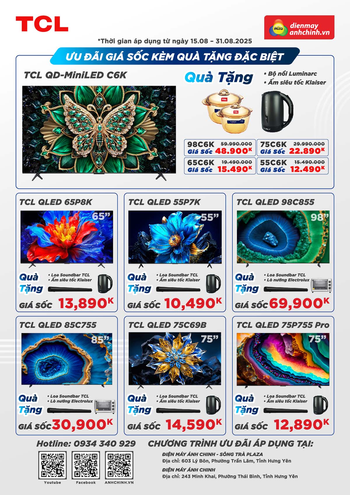 🌟 Từ 15.08 – 31.08.2025, ghé ngay TCL booth tại cửa hàng Điện Máy Ánh Chinh (Sông Trà Plaza) - 603 Lý Bôn, Phường Trần Lãm, Tỉnh Hưng Yên và 243 Minh Khai, Phường Thái Bình, Tỉnh Hưng Yên – nơi cảm hứng công nghệ bùng nổ, từng khoảnh khắc đều xứng đáng "chốt đơn"!