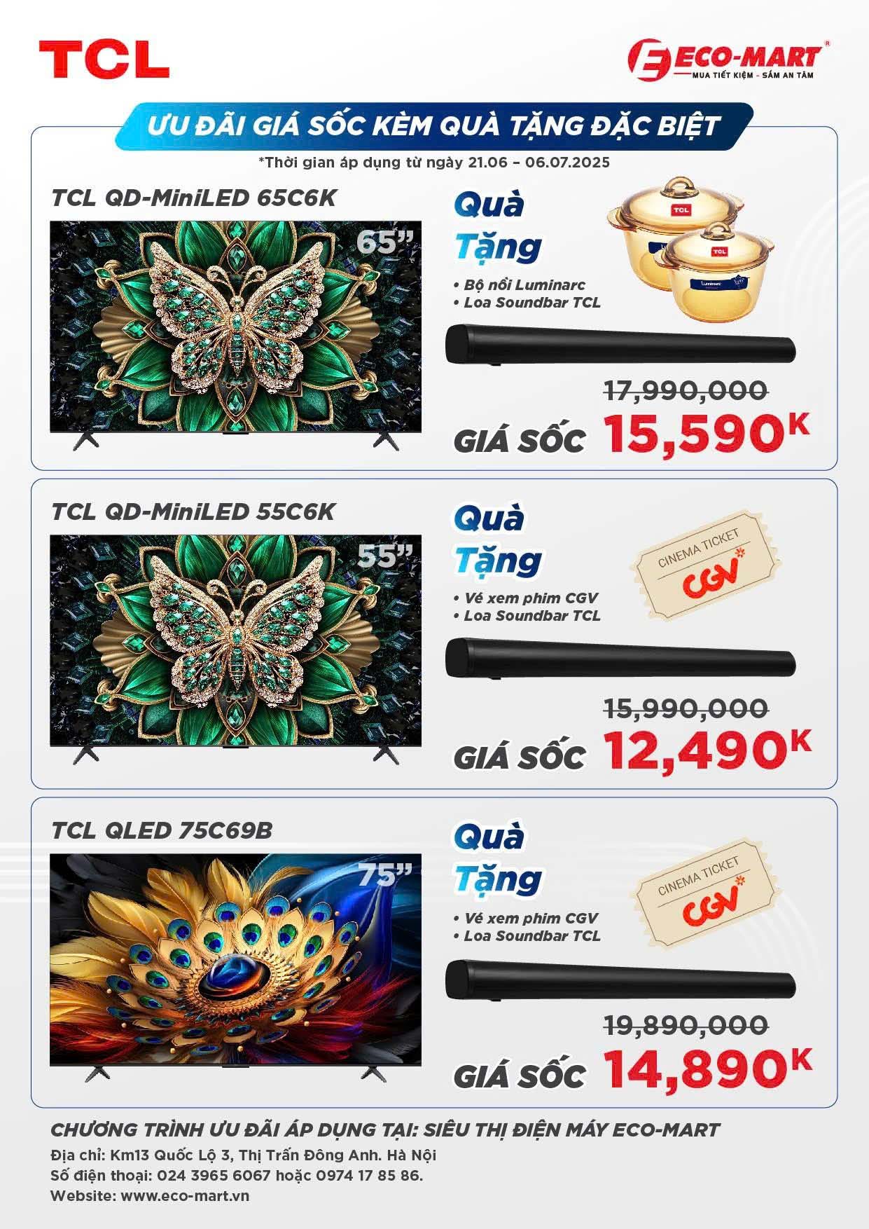 🌟 Từ 21.06 – 06.07.2025, ghé ngay TCL booth tại cửa hàng Eco-Mart Đông Anh, Hà Nội – nơi cảm hứng công nghệ bùng nổ, từng khoảnh khắc đều xứng đáng "chốt đơn"!
