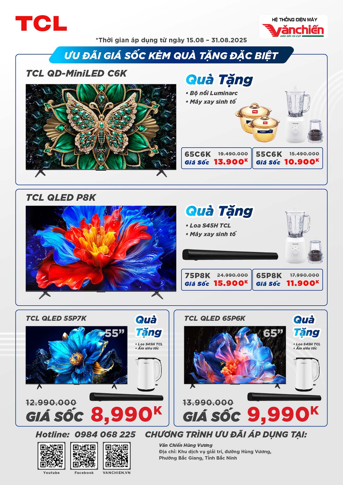 🌟 Từ 15.08 – 31.08.2025, ghé ngay TCL booth tại cửa hàng Văn Chiến Hùng Vương (Khu dịch vụ giải trí, đường Hùng Vương, Phường Bắc Giang, Tỉnh Bắc Ninh) - nơi cảm hứng công nghệ bùng nổ, từng khoảnh khắc đều xứng đáng "chốt đơn"!